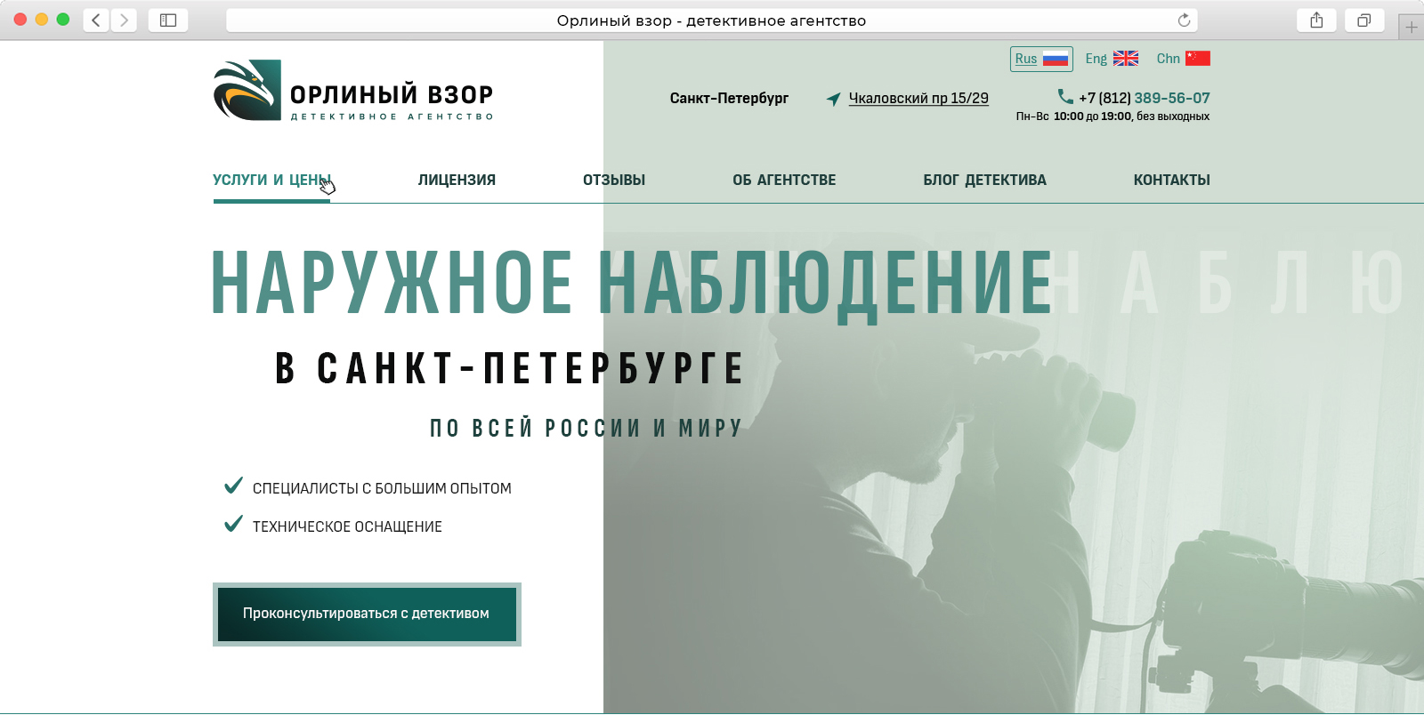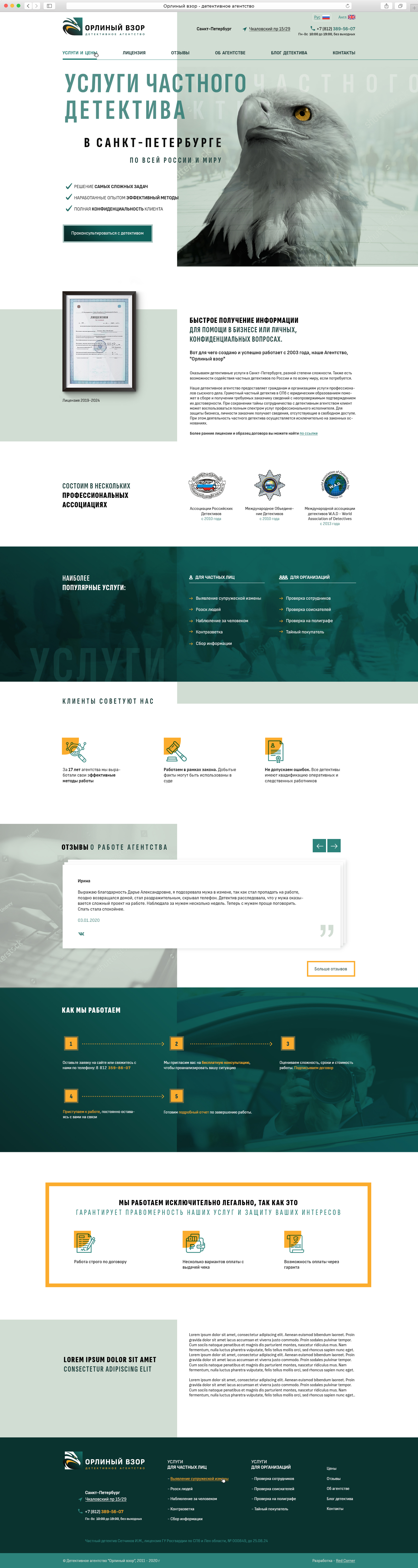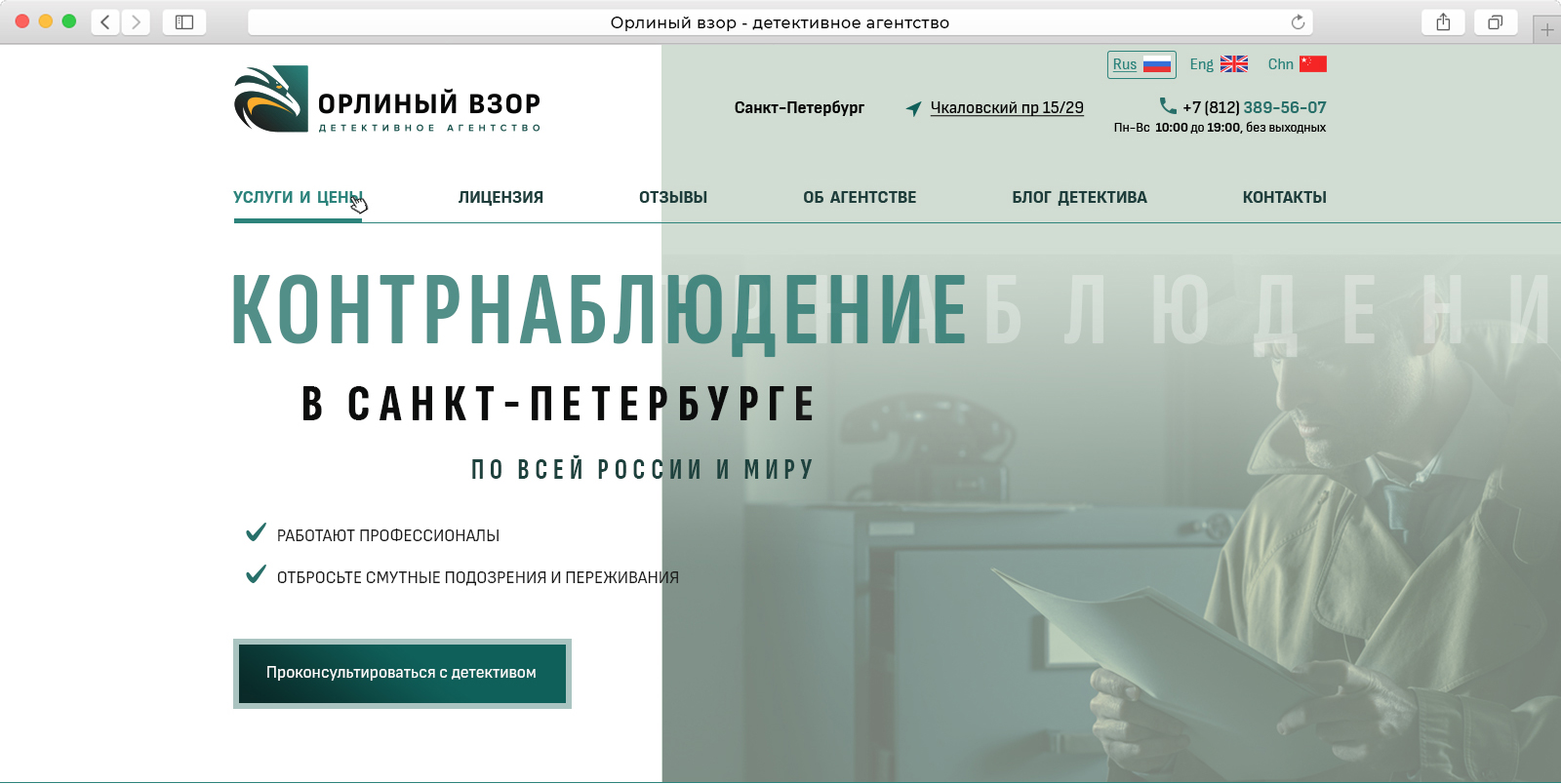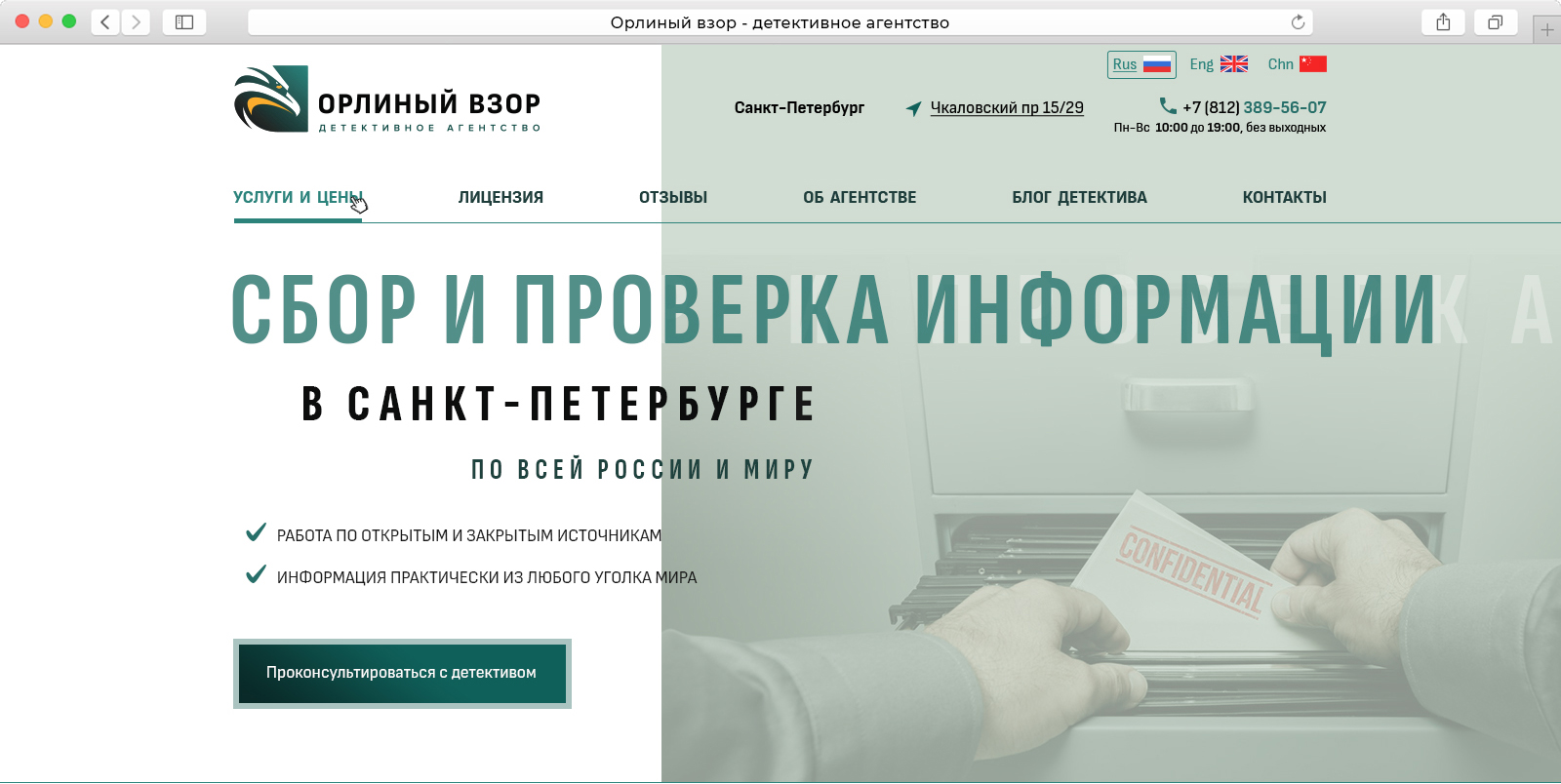 Детективное агентство Орлиный Взор работает с 2006 года. Агентство выполняет услуги в РФ и по всему миру, аккредитовано и признано российскими и мировыми ассоциациями детективов (и такие есть :) )